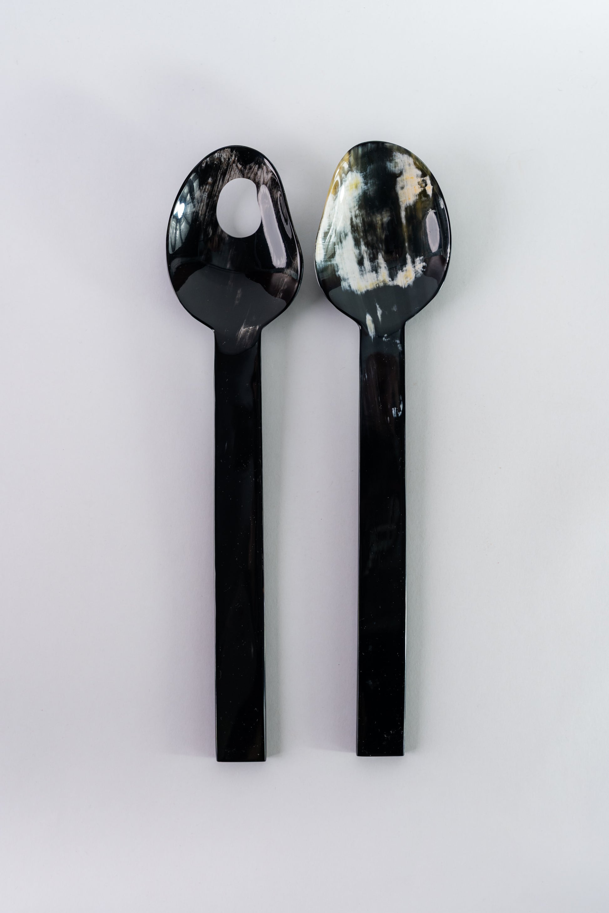 Experience the beauty of handcrafted flatware with rivêt - indochineur's Black Souche salad servers. Crafted from upcycled materials, these French-inspired serving pieces add a touch of elegance to any table setting. They are not only eco-friendly but also unique, providing a blend of functionality and style. Carefully designed, they reflect the brand's dedication to linking cultures and creating meaningful objects. Please ensure to hand wash these servers to maintain their pristine condition.